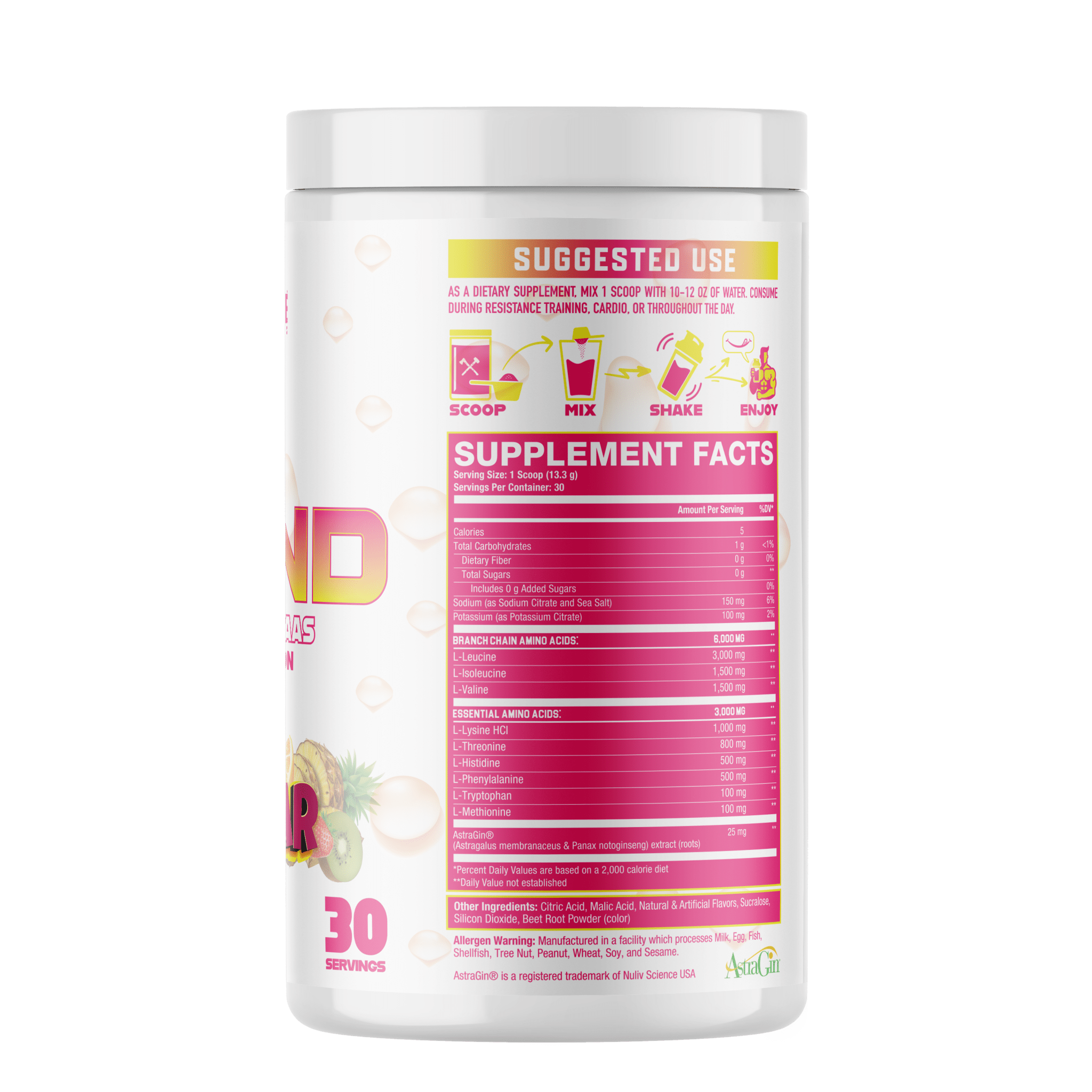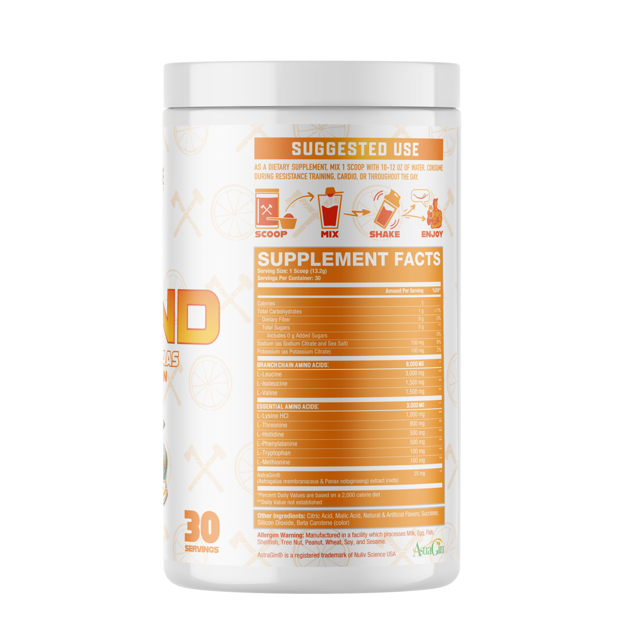 As a dietary supplement, mix 1 scoop with 10-12oz of water. Consume during resistance training, cardio, or throughout the day.